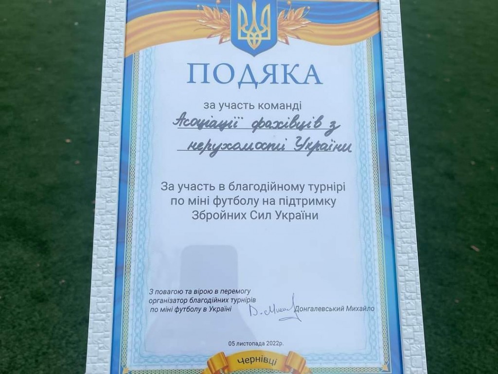 Як підкреслила в кінці турніру Голова Чернівецького регіонального відділення АФНУ Зоряна Вакарчук: «Члени Асоціації фахівців з нерухомості України не стоять осторонь, а готові активно підтримувати військових на передовій. Дякуємо організаторам за можливість прийняти участь у турнірі та внести свій вклад в нашу перемогу.»