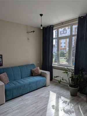 + Загальна площа квартири сорок дев"ять квадратних метрів – простора кухня – студіо, затишна спальня, містка гардеробна кімната.