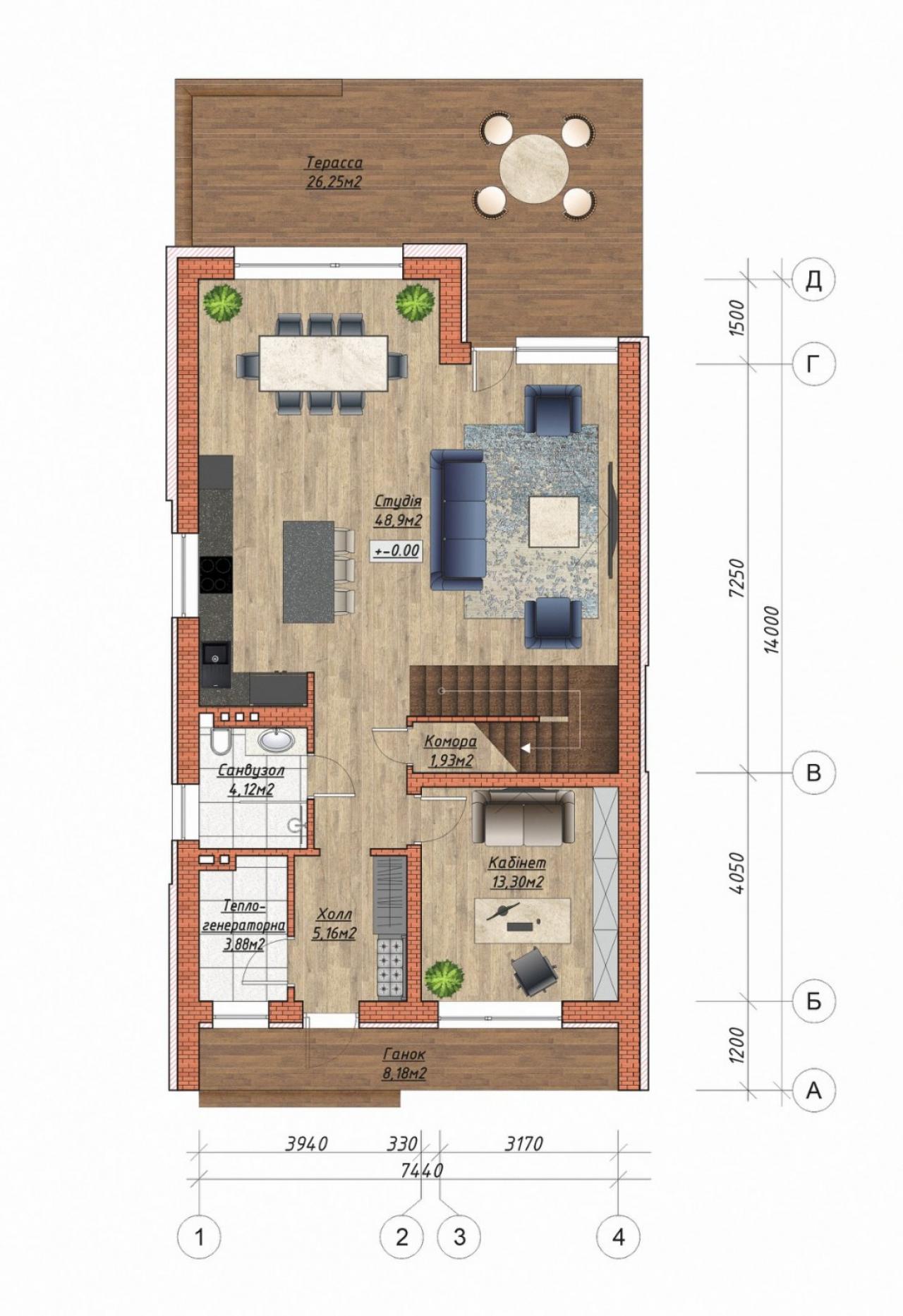 Будинок загальною площею 177 кв.м., на першому поверсі - простора кухня-вітальня з виходом на терасу, санвузол, гостьова кімната, котельня, на другому поверсі - дві спальні та господарська спальня з санвузлом та гардеробною та санвузол.