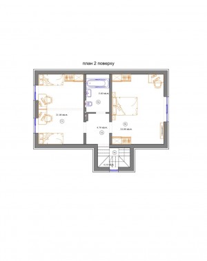 На другому поверсі 2 просторі кімнати з панорамними вікнами-21 квм та 24квм та санвузол.