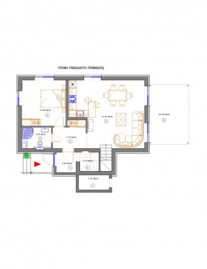 На першому поверсі кухня-вітальня-31 квм,житлова кімната-14квм,санвузол,комора.