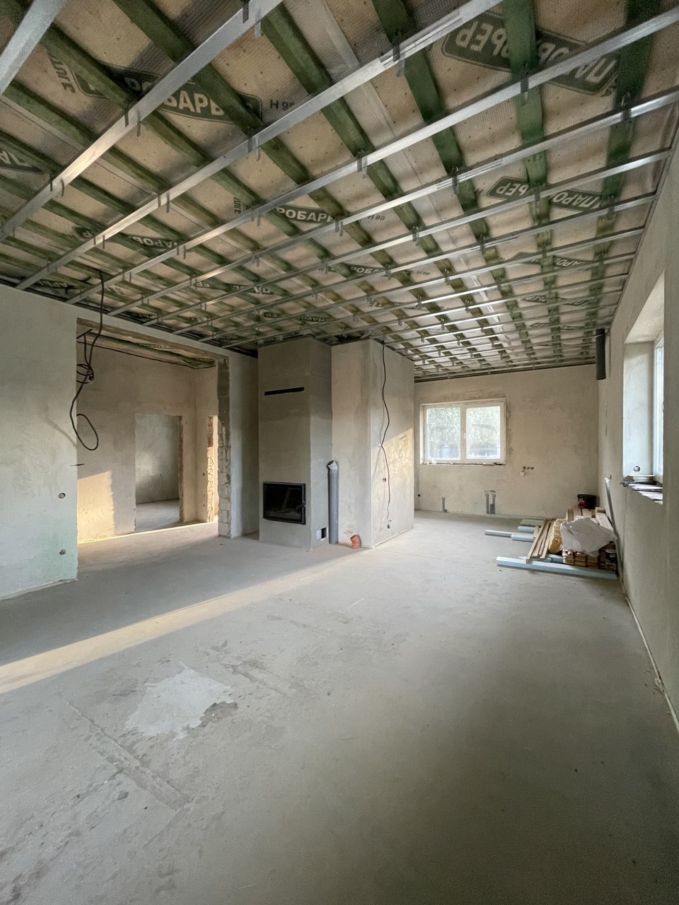 Планування: тамбур, коридор, вітальня з вже встановленим каміном фірми Dovre та виходом на криту терасу, кухня, дві спальні, санвузол, технічне приміщення та мансардний поверх оздоблений деревом з відкритим простором.