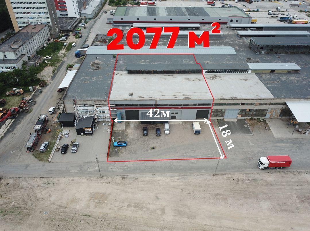ХАРАКТЕРИСТИКИ: - площа: 2077м.в - офіс бл. 180 м.кв. - земельна ділянка 18 м від приміщеня - висота стелі: 6-10 м - висота воріт: 5 м. - крок колон: 18х12 - цілодобовий доступ до приміщення - свій санвузол - парковка на більше 12 місць - може розвернутись TIR - рівна підлога - можливість рампи - утеплений фасад - дах ПВХ