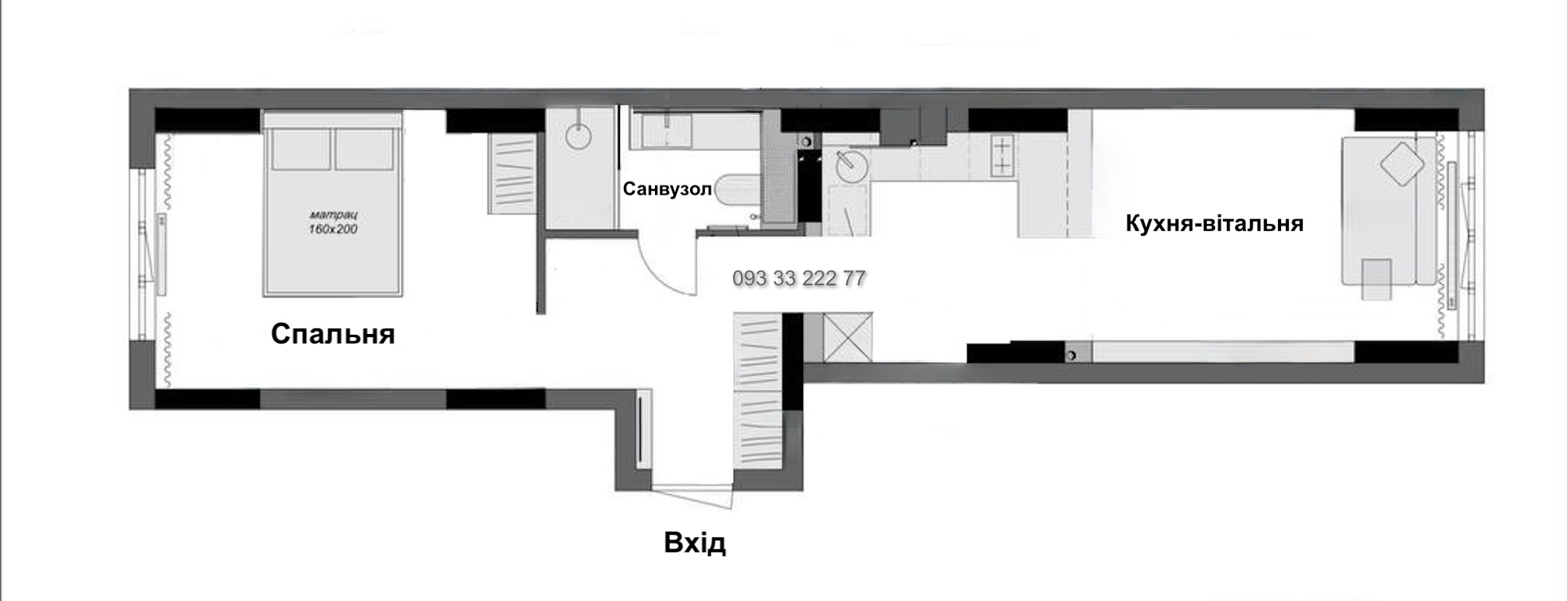 Загальна площа квартири: 49.5 м2, кухня-вітальня: 22,8 м2, спальня: 15.2 м2, Санвузол 4,5 м2.