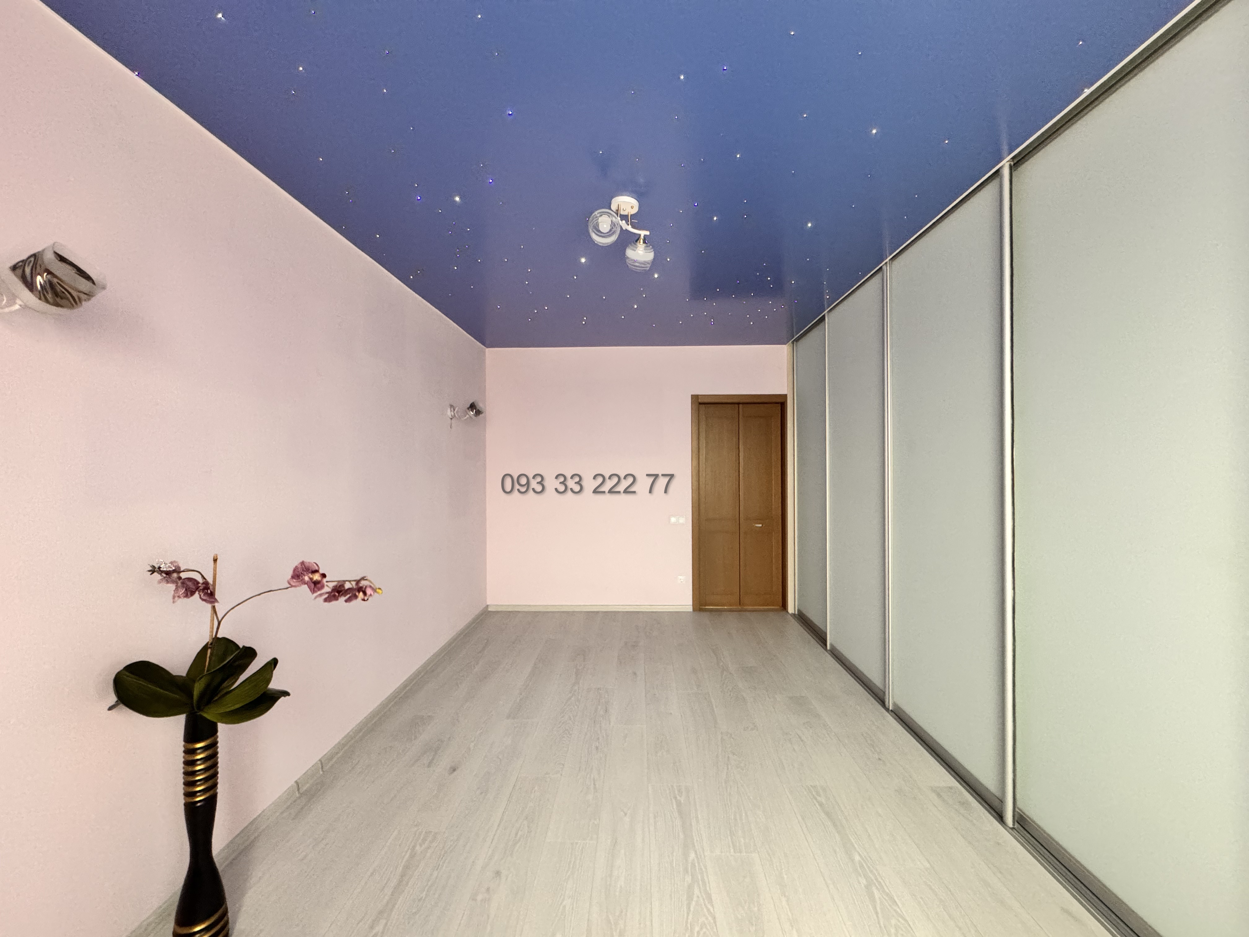 В кімнаті площєю 18 кв.м. розташована вмістка шафа-купе, на стелі підвісна стеля з ефектом зоряного неба(виглядає дуже ефектно).