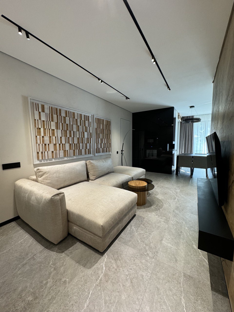 ОСНАЩЕННЯ КВАРТИРИ . всі корпусні та м’які меблі Frankoff . багато різних сценаріїв освітлення . декоративна штукатурка у всіх приміщеннях . ексклюзивна акцентна стіна під камінь, виконана вручну художниками та штукатурами . біокамін . вбудована побутова техніка . кондиціонер
