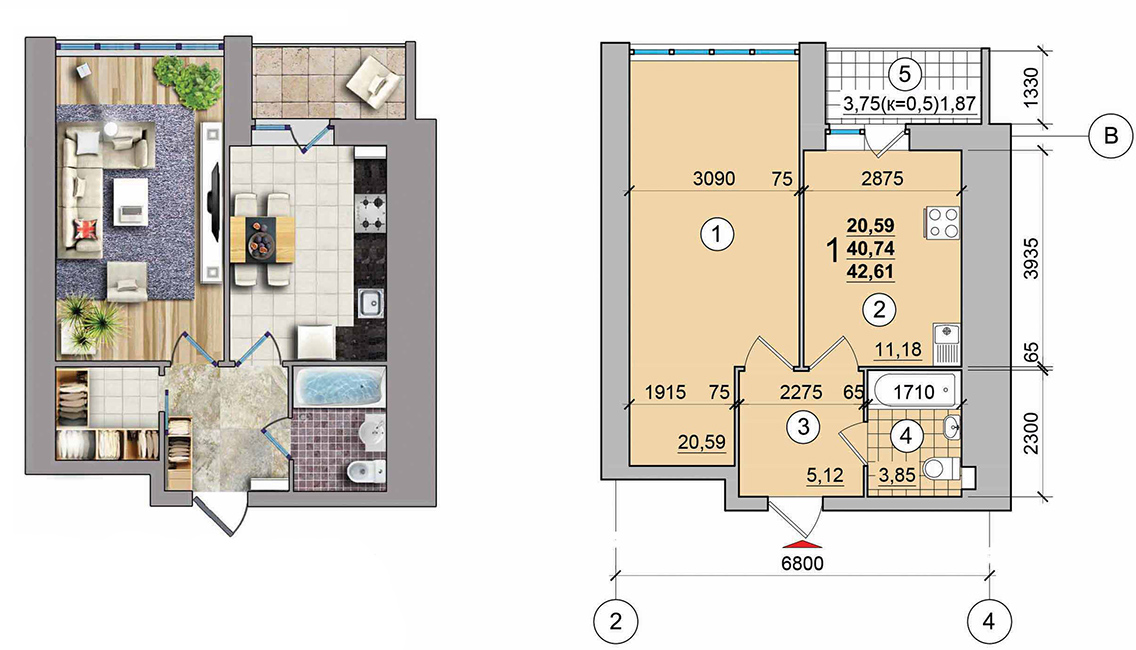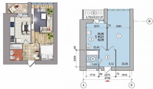 1-кімн.кв. загальною площею: 42,08м,