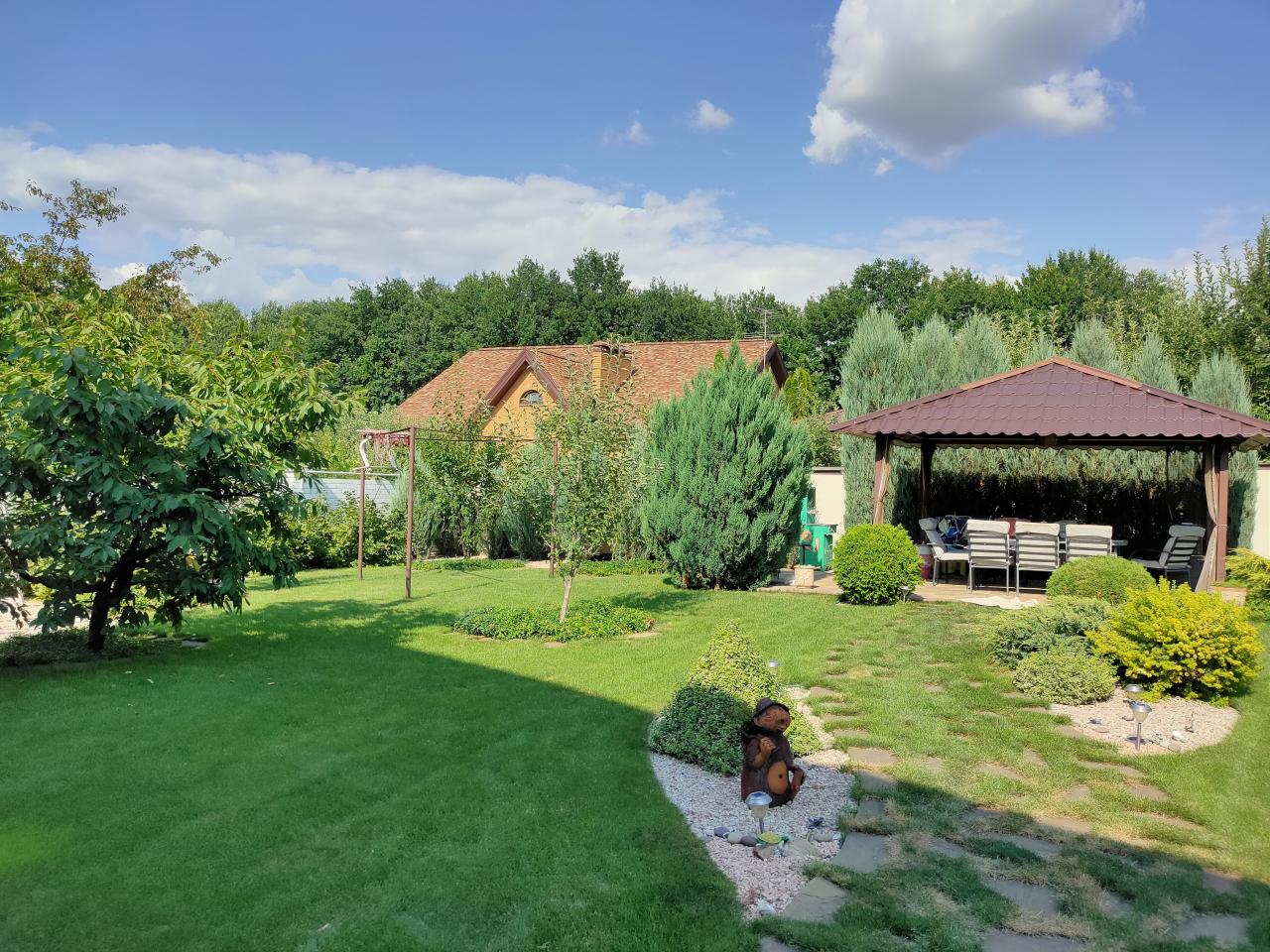 -Участок 20 соток, приватизирован, качественный газон, беседка, гараж на две машины, декоративные и другие виды растений, есть место для каркасного бассейна.