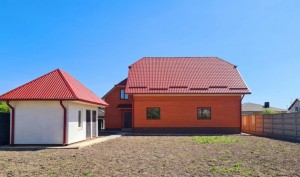Збудований із цегли,утеплення -мінеральна вата,дах-металочерепиця.
