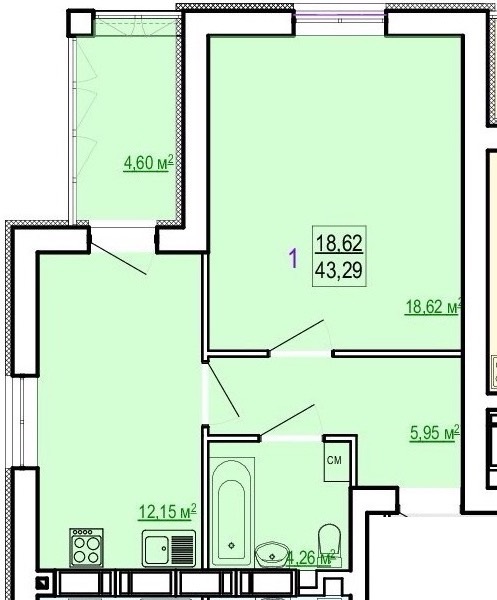 Загальна площа: 43.29 кв.м