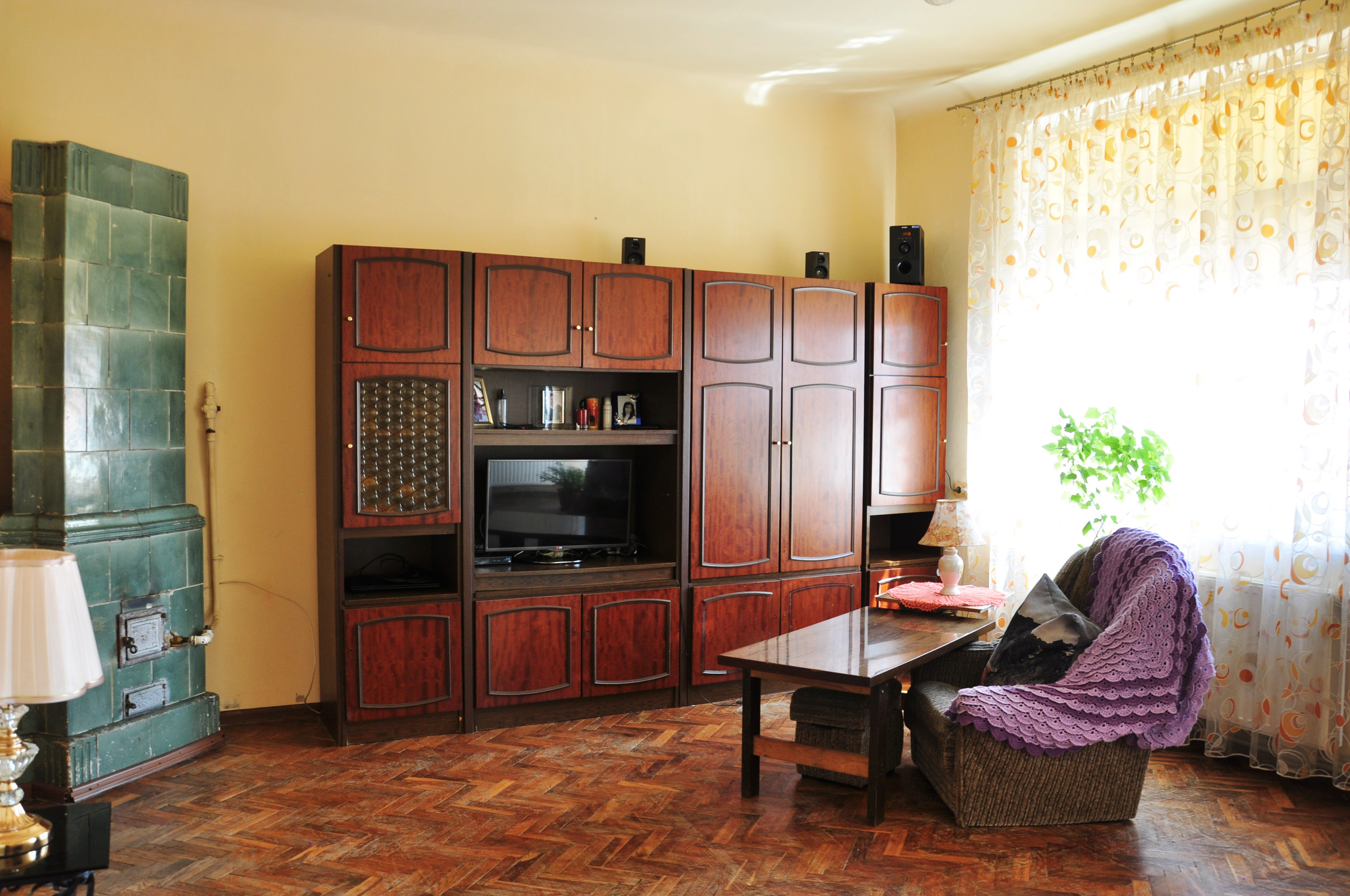 Автентичне паркетне покриття та кахельні печі.