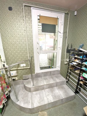 Фасадний, із замощеним майданчиком, навісом. Два входи.