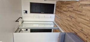 Тепла підлога, пральна машина, духовка, варильна поверхня, бойлер, велика шафа, вбудована кухня, кондиционер, німецька душова кабіна та виложений мозаїкою піддон душової кабіни, Смарт-ТВ, інтернет, диван, великий стіл для праці та відпочинку.