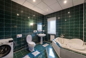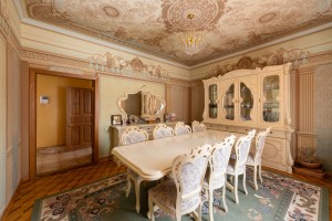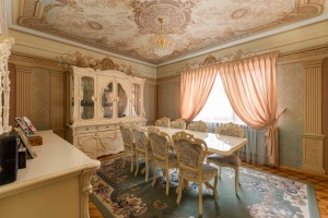 Скрізь плитка, у вітальні камін з мармуру, деревяні елементи на стелі та авторський розпис. Італійський гарнітур, паркетна дошка з натурального дерева.